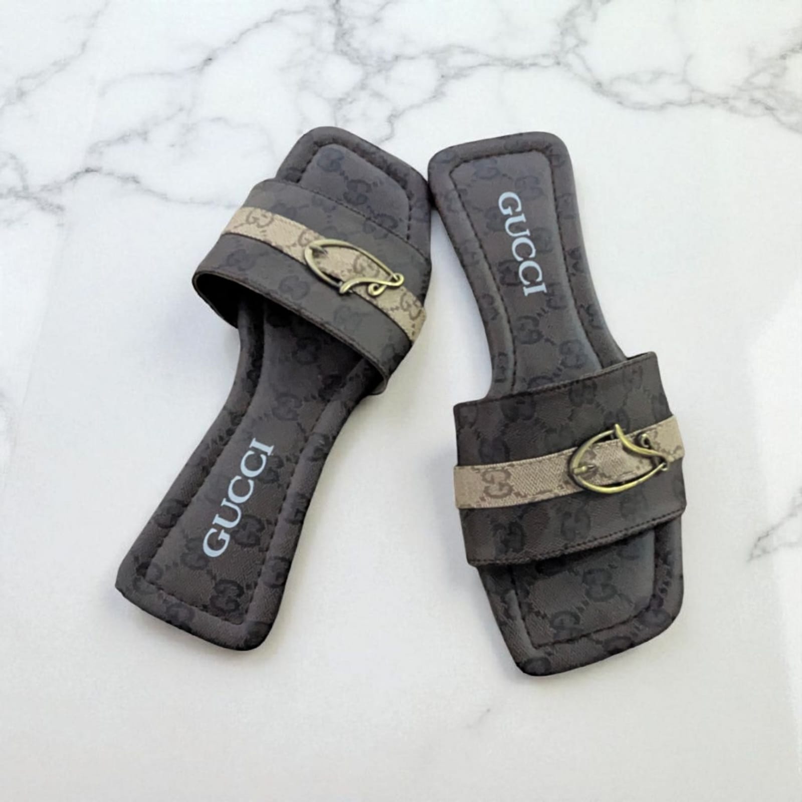Elevate your everyday style with these dark-tone luxury monogram flat slides, crafted for women who love premium elegance. These designer-inspired flats feature a sleek black-on-black GG pattern with a contrasting beige strap and gold buckle for a sophisticated touch. Designed with a soft footbed and wide strap for maximum comfort.